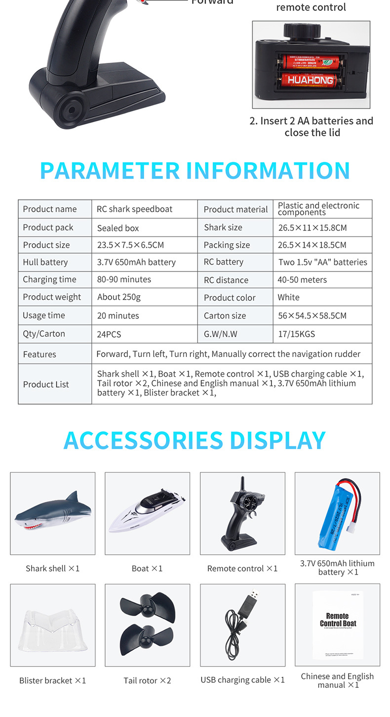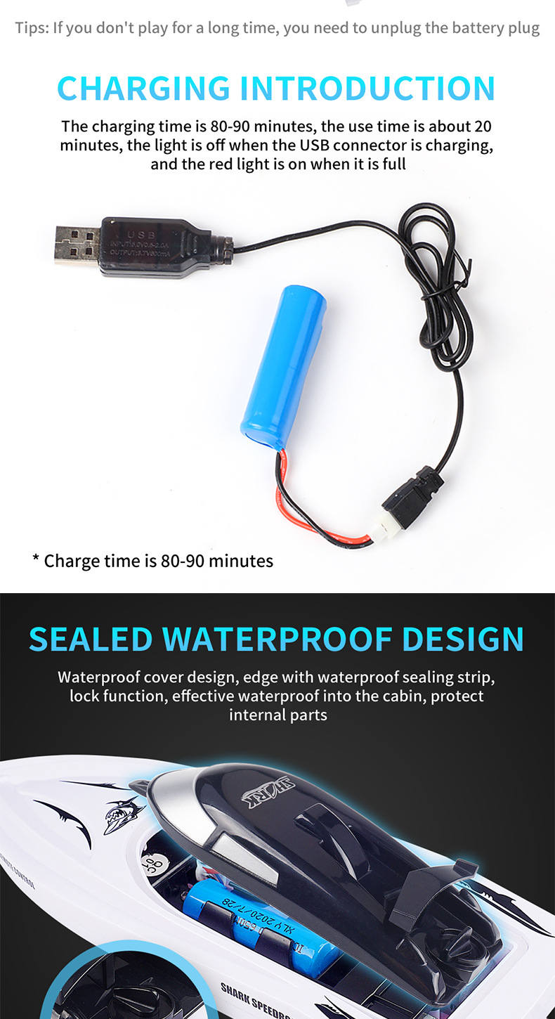 3. Chargement USB : batterie lithium-polymère rechargeable intégrée de 3,7 V et 320 mAh, et câble de chargement USB inclus. Le requin peut nager pendant 20 minutes (30 minutes) avec une batterie complètement chargée.