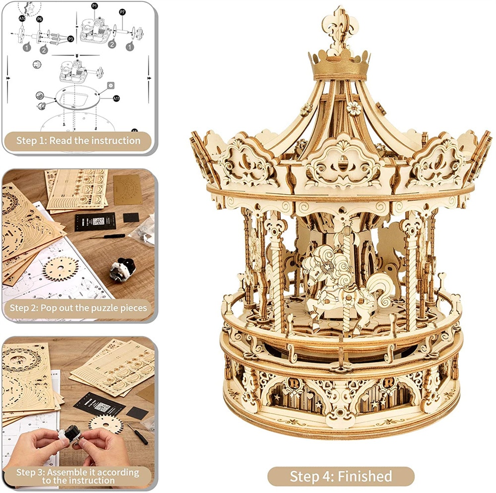 Robotime Rokr 3D Wooden Puzzles Construction Model Kit DIY Music Box Building Kits Rotating - Romantic Carousel