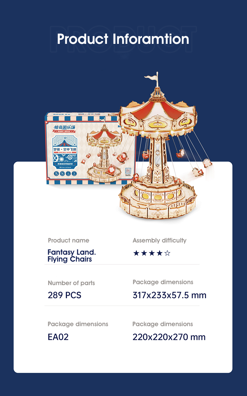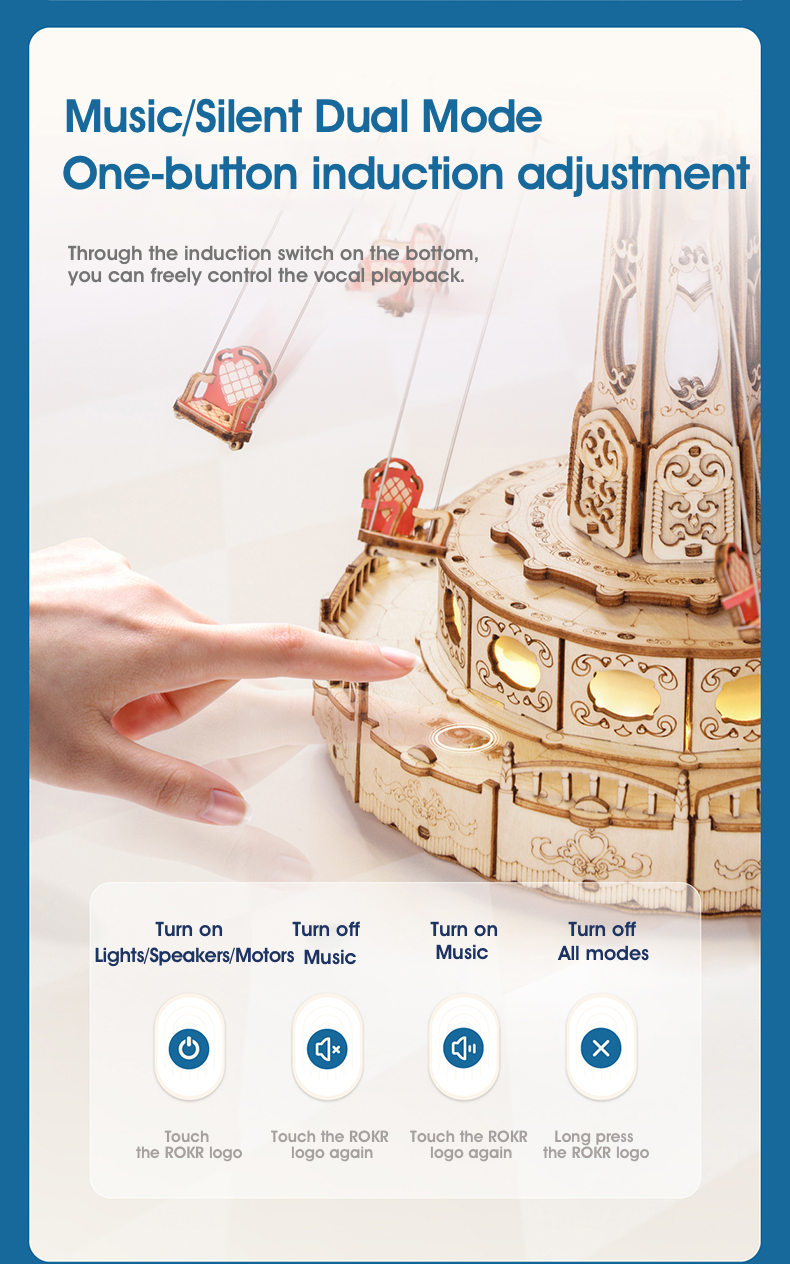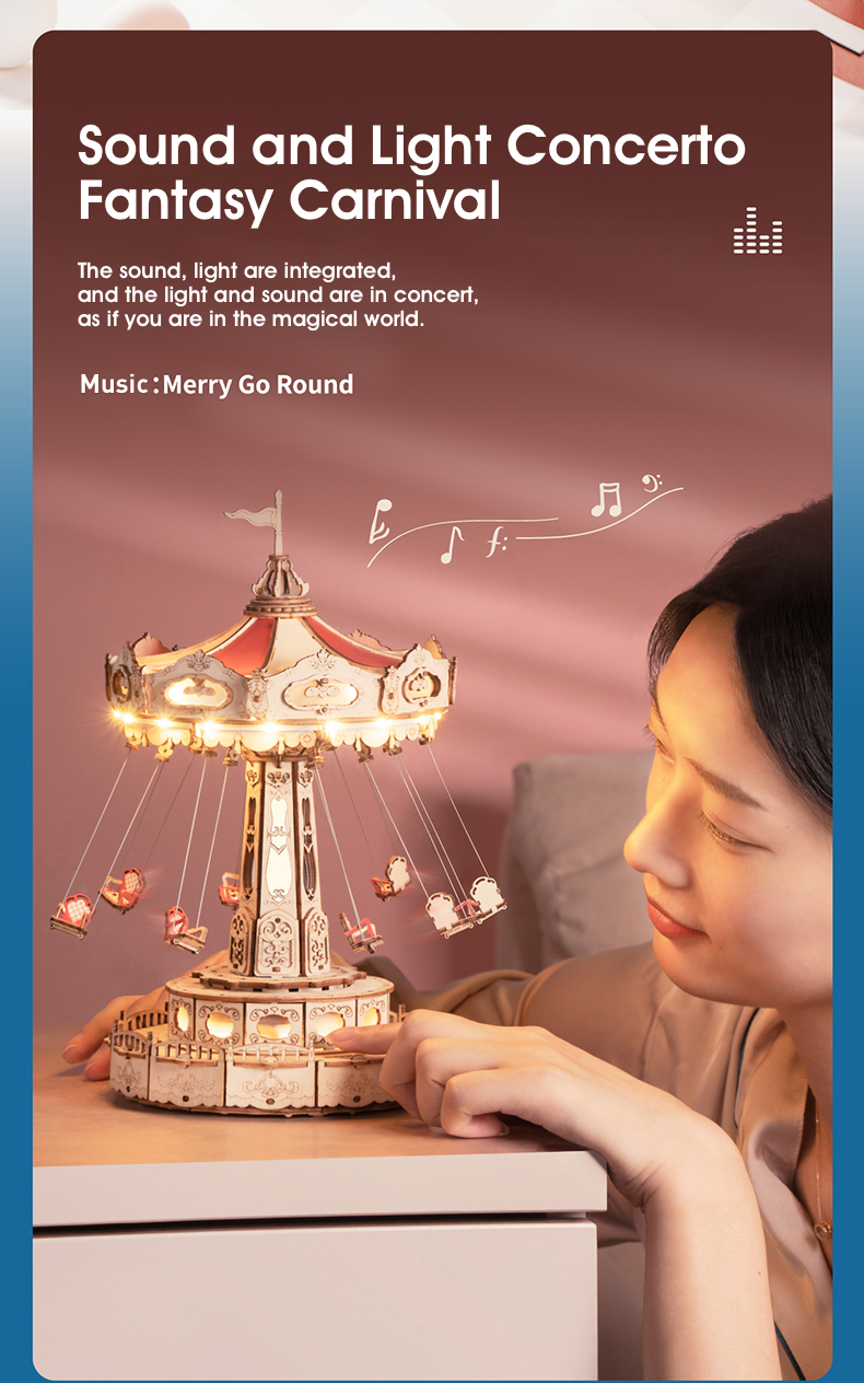 With built-in movement, the seats will be suspended from the rotating top of the carousel with music and lights on by simply touching the button. Build this exquisite 3D wooden puzzle with your hands and enjoy the ride!