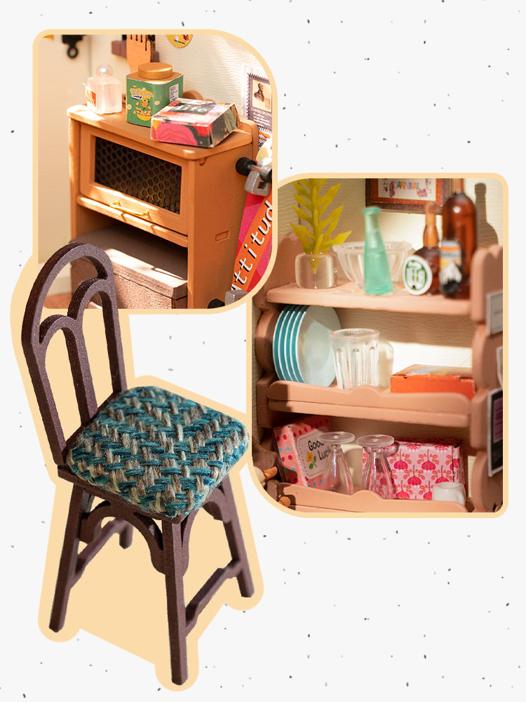 【Dollhouse Feature】To build it, patience is the ultimate key to success.It can be assembled with family, friends and lovers to experience the pleasure of hands-on.A sense of accomplishment will come when it is finished.You can redecorate it and add in your new creation.After turning on the light, it makes a comfy, cute room to look at once and awhile.